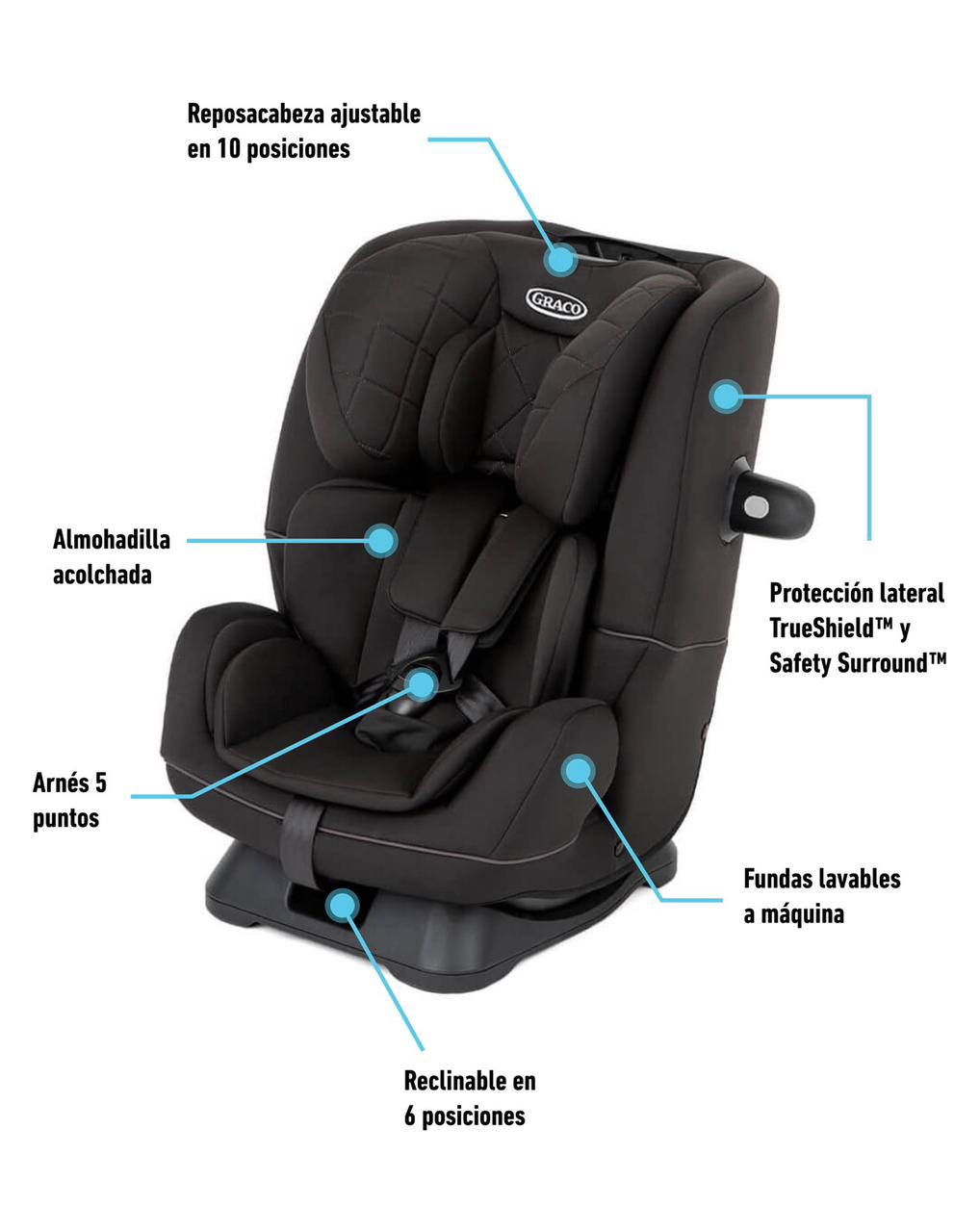 Este asiento convertible 2-en-1 crece con tu hijo desde recién nacido hasta los 12 años (145 cm), cumpliendo con la norma europea R129, que ofrece mayor protección lateral y mantiene al niño mirando hacia atrás por más tiempo. Se usa a contramarcha desde el nacimiento hasta los 105 cm y luego como booster con respaldo hasta los 145 cm. Incorpora protección lateral TrueShield™ y Safety Surround™, arnés de 5 puntos de ajuste fácil, sistema de instalación con belt lock-off y reclinado en 6 posiciones.