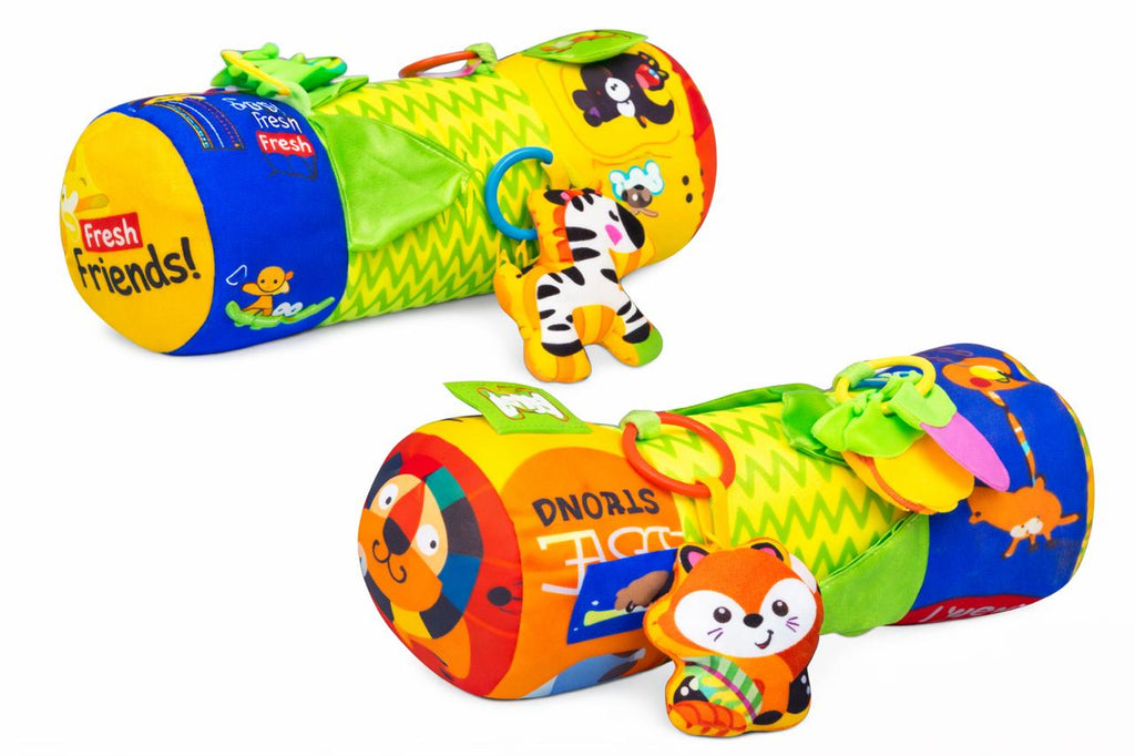 La almohada rodillo es ideal para estimular a tu bebé mientras está boca abajo! Esta posición ayuda a desarrollar fuerza en la parte superior del cuerpo, controla el peso de la cabeza y fortalece los músculos del cuello y los brazos. Viene con un sonajero, hojas de tela arrugada, y un peluche, además de un peluche de cebra y zorrito con ruiditos simpáticos, y 3 mordillos con formas de fruta para una experiencia de juego completa y entretenida.