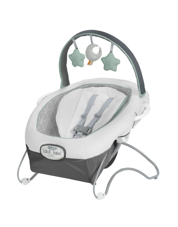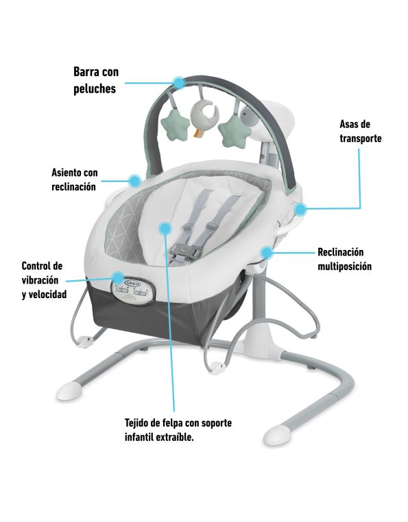 Vibración con 2 configuraciones de velocidad para que el bebé se mantenga relajado. Elija entre 6 canciones y sonidos para ayudar a calmar y divertir al bebé. La barra de juguetes ajustable tiene 3 juguetes blandos para entretener al bebé y se puede quitar fácilmente para facilitar el acceso al bebé.