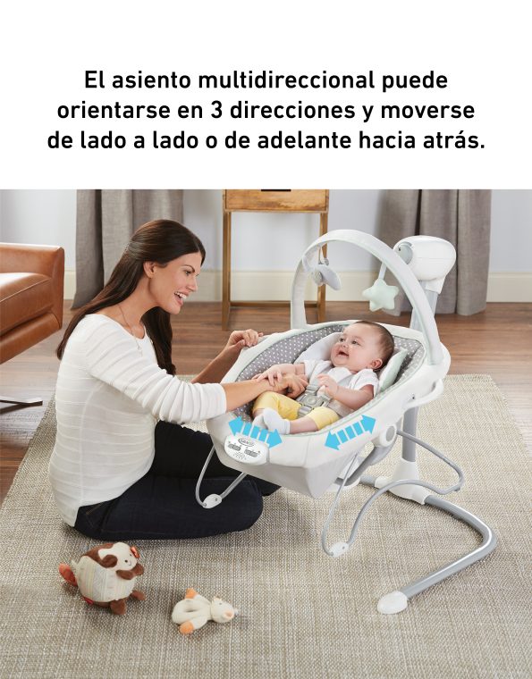 funciona como un bouncer portátil con asas de transporte para mantener a su hijo a su lado en toda la casa. El asiento multidireccional permite que el bebé disfrute de un balanceo de lado a lado o de adelante hacia atrás para más opciones relajantes. Las velocidades de balanceo ajustables le permiten encontrar el ritmo adecuado y la reclinación en varias posiciones garantizará la comodidad del bebé.
