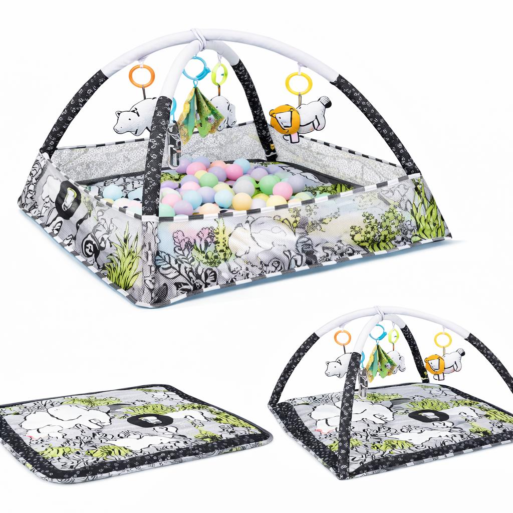 Gimnasio Pelotero c/ Actividades Gris - Diversión y desarrollo desde el primer día. Diseñado para estimular los sentidos y fortalecer la motricidad de tu bebé hasta los 18 meses, se adapta a cada etapa con cuatro formas de juego: acostado boca arriba, boca abajo, sentado o explorando sus juguetes colgantes. Sus colores vibrantes, 5 juguetes removibles y pelotas interactivas despiertan la curiosidad y aseguran horas de entretenimiento y aprendizaje en cada fase del crecimiento. Uso: desde el nacimiento.