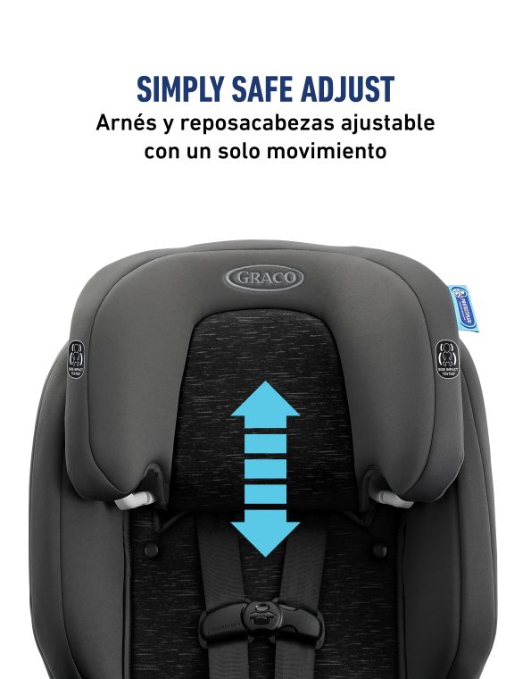 El sistema Simply Safe Adjust™ permite ajustar el arnés y el reposacabezas juntos con un solo movimiento, sin necesidad de reensamblar el arnés. Con un marco reforzado con acero para mayor resistencia y durabilidad, y una reclinación de 4 posiciones para comodidad, este asiento también incluye un reposacabezas ajustable de 10 posiciones para adaptarse
