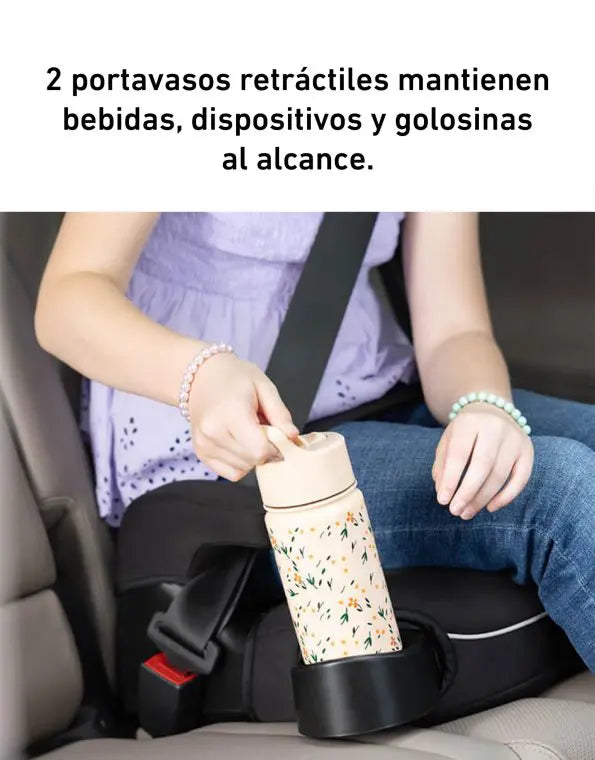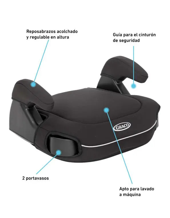 Este booster sin respaldo, certificado por R129, es ligero con solo 1.4 kg, lo que facilita su traslado entre vehículos, y cuenta con una funda lavable a máquina para una limpieza sencilla.