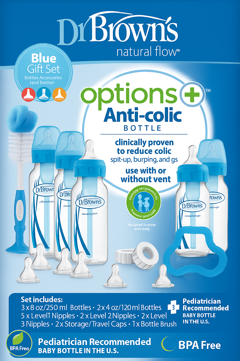 Dr. Brown’s Set de 5 Biberones Options+ Anti-Cólicos – Rosa / Celeste - 854587 / 854588